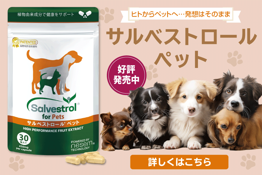 健康を重視する飼い主様のニーズに応え、ペット向けサプリメント「サルベストロール ペット」がついに発売されました。